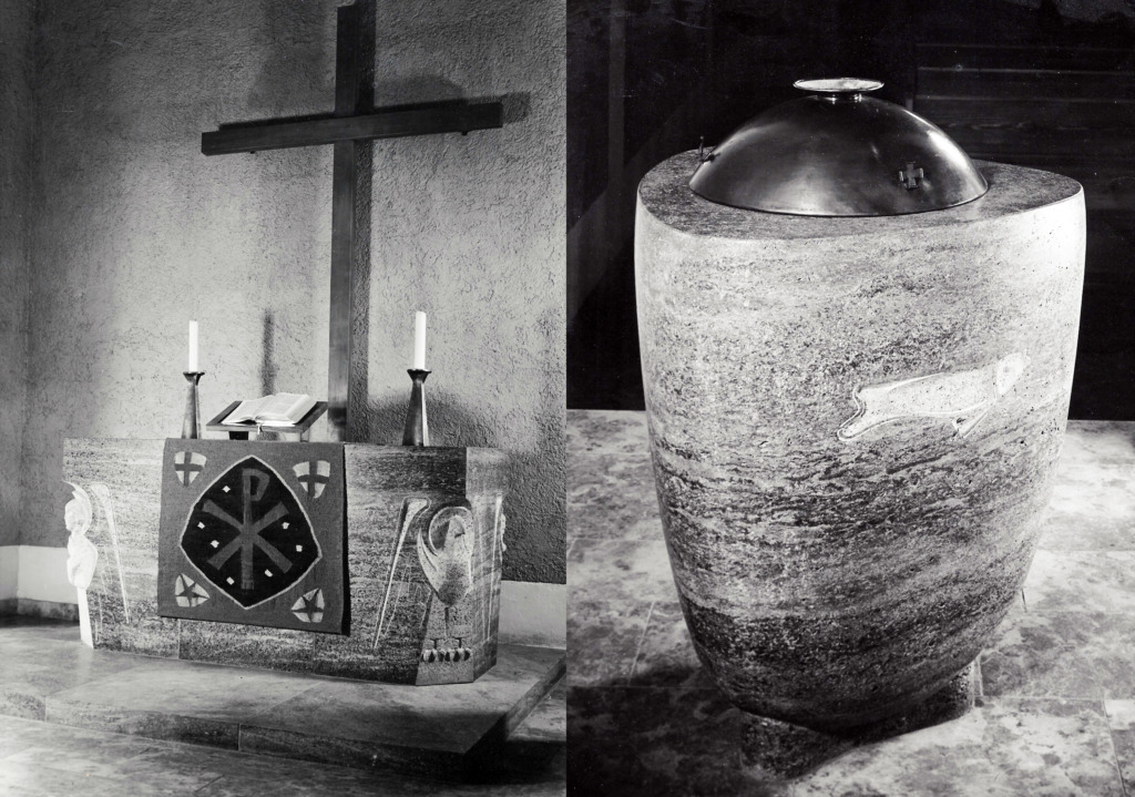 Titel: Altar und Taufstein Serie: Unikat Jahr: 1955 Kategorien: öffentl. Raum Technik: Stein Sammlung: Kirche Stuttgart-Degerloch Foto: Friedrich Diesener