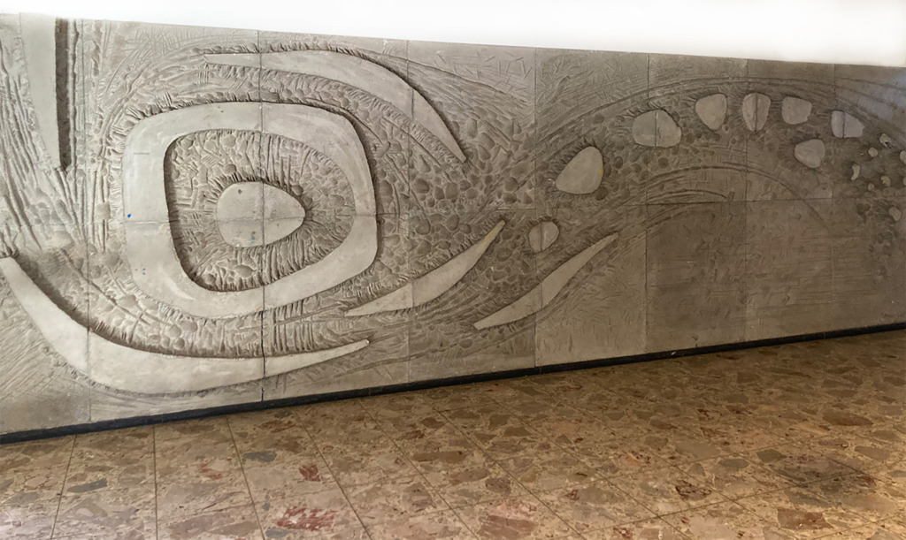 Titel: Betonwand Gymnasium Trossingen Serie: Unikat Jahr: 1967 Kategorien: öffentl. Raum Technik: Beton Größe: 237 x 780 cm Foto: Markus Eisele