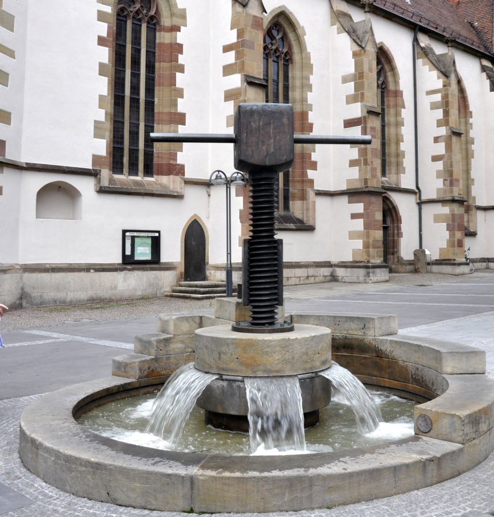 Titel: Brunnen mit Weinpresse Serie: Unikat Jahr: 1991 Kategorien: öffentl. Raum Technik: Sandstein + Bronze Sammlung: Stadt Stuttgart Rathaus Bad Cannstatt, Markststraße