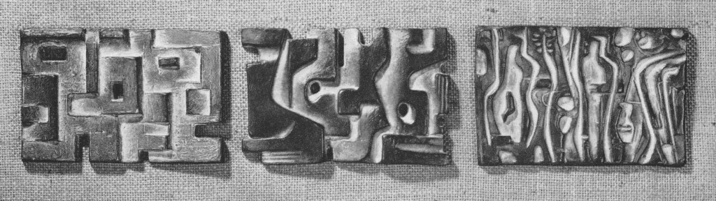 Titel: Entwicklungsstufen zu ‚Werden – Sein – Vergehen‘ Serie: Auflage 6 Jahr: 1965 Kategorien: Modelle u. A. Technik: Bronze Größe: 11 x 17 cm Sammlung: Privat Relief Architektonisch Vegetabil Familie