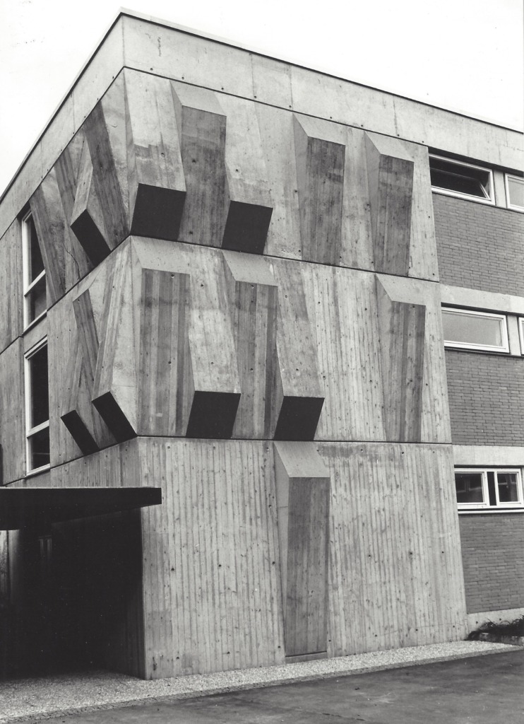 Titel: Fassadenrelief Eckgestaltung Jahr: 1970 Kategorien: öffentl. Raum Technik: Schalbeton + teilweise Farbe Sammlung: Hölderlingymnasium Stuttgart