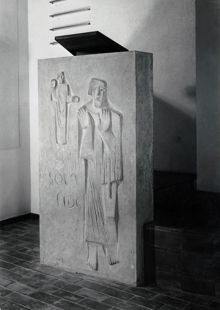 Titel: Kanzelplatte Serie: Unikat Jahr: 1959 Kategorien: Figurationen, öffentl. Raum Technik: Stein Sammlung: Pauluskirche Mengen Foto: Friedrich Diesener