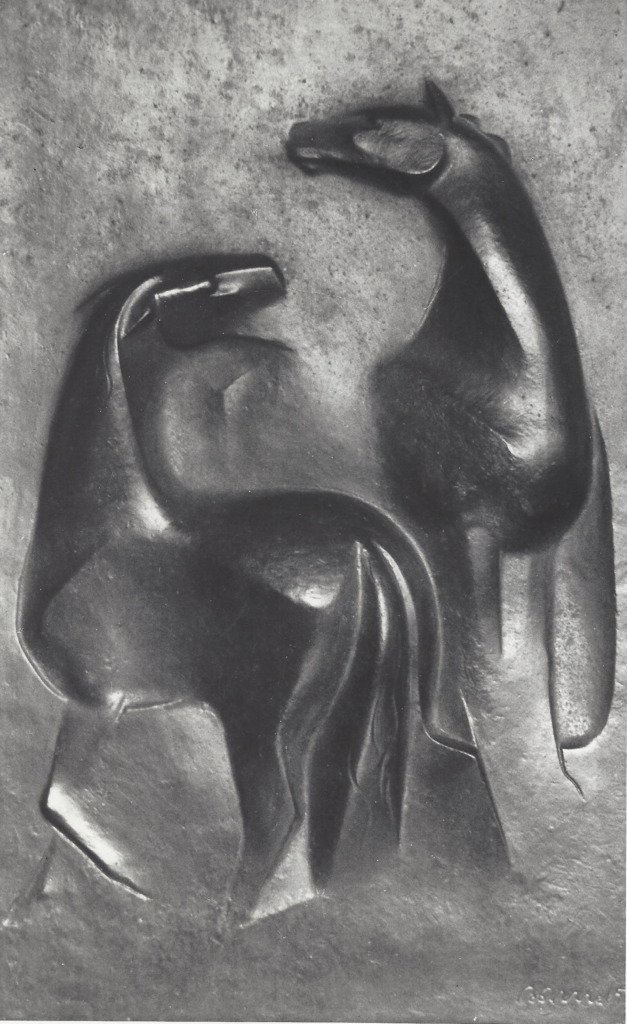 Titel: Pferderelief Serie: Auflage unbekannt Jahr: 1953/54 Kategorien: Figurationen Technik: Bronze Größe: 45 x 70 cm Sammlung: privat Preis: auf Anfrage Foto: Hans Vetter