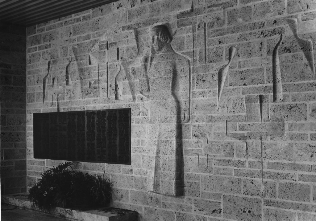 Titel: Reliefwand Serie: Unikat Jahr: 1957 Kategorien: öffentl. Raum Sammlung: Friedhof Gomaringen Architekt: Eugen Riehle, Reutlingen Foto: Friedrich Diessener