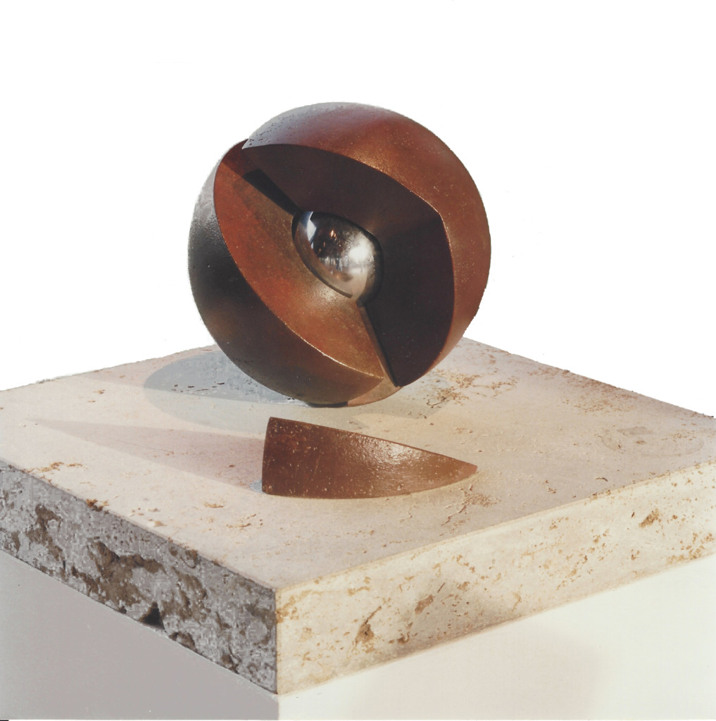 Titel: Schale und Kern Serie: Unikat Jahr: 1985/86 Kategorien: Kugeln, Modelle u. A. Technik: Alu-Guss mit Farbe + V2A-Stahl + Steinplatte Größe: Ø = 20 cm + 10 x 40 x 40 cm Sammlung: Privat (Göttingen)