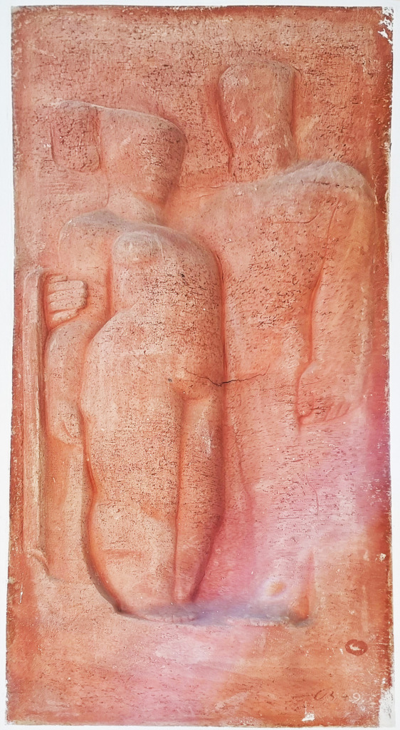 Titel: Terracottarelief ‚Menschenpaar! Serie: Unikat Jahr: 1949 Kategorien: Figurationen, öffentl. Raum Technik: Terracotta Größe: 165 x 75 cm ehemals Killesbergbad, Stuttgart (verschollen)