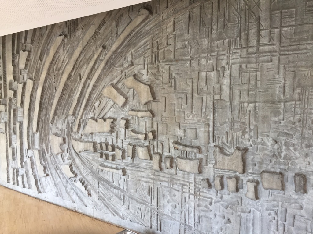 Titel: Reliefwand Serie: Unikat Jahr: 1969 Kategorien: öffentl. Raum Technik: Beton Größe: 250 x 700 cm Sammlung: Congress Centrum Böblingen / Sindelfingen (Eingang Kleiner Saal) Foto: Corinna Steimel